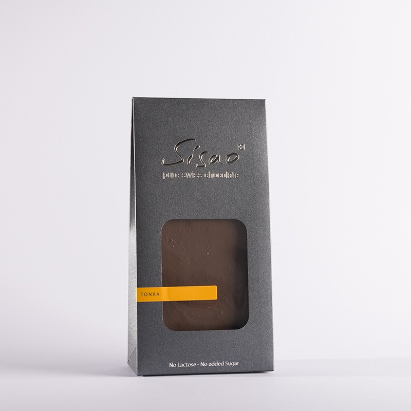Fines feuilles de chocolat au lait (42 %) à la fève de Tonka (120 g).Sans lactose et sans sucre ajouté.