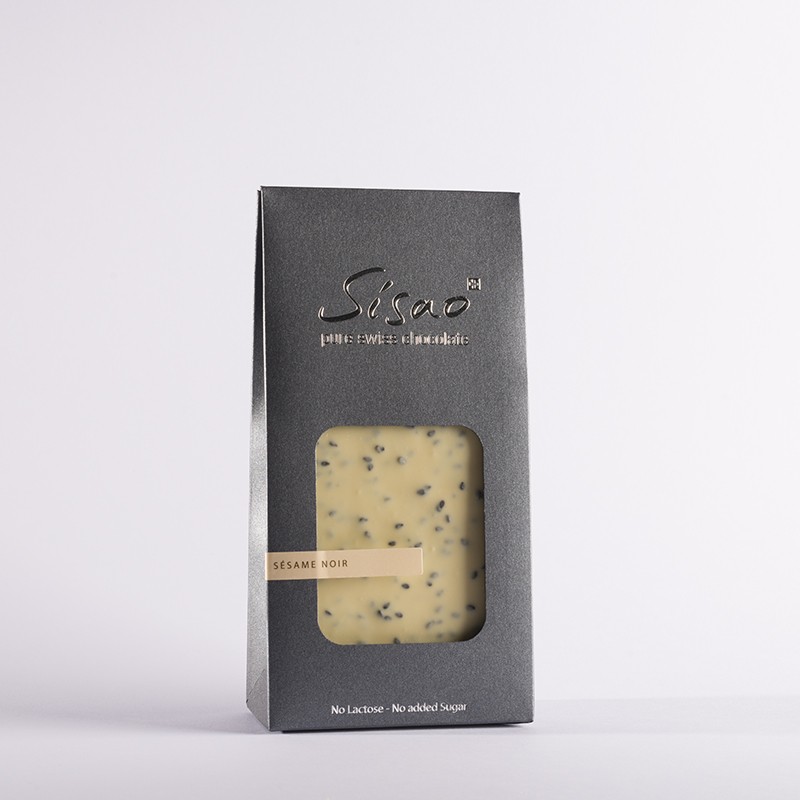 Fines feuilles de chocolat blanc (36%) aux sésames noir (120 g).
